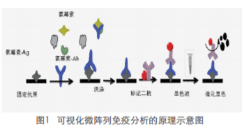 NaCl、KCl、NA2HPO4 .12H2O、KH2PO4、吐 溫20、乙二胺四乙酸(EDTA):分析純,南京化學(xué) 試劑有限公司;牛血清白蛋白(BSA):99%,w/w 美國默克公司;氯霉素標(biāo)準(zhǔn)品:Sigma公司;氯霉 素抗體、納米材料標(biāo)記的二抗、銀增強顯色溶液 (A液、B液):南京祥中生物科技有限公司。 實驗所用水均為18.25 MΩ/cm純凈水(Milli-Q 水凈化系統(tǒng))。10 mmol/L PBS(磷酸鹽緩沖液) pH7.2作為分析緩沖液。洗滌緩沖液PBS含0.05% 吐溫20(PBST)。封閉劑為1% BSA。所有緩沖液在使用前通過0.22 µm孔徑過濾器過濾。生物芯片點樣儀:清華大學(xué);ELx50自動洗板 機(jī):美國biotech儀器有限公司;MD-200恒溫振蕩 儀Thermo-shaker、Qarray 2000芯片分析儀、96孔 板芯片載體:南京祥中生物科技有限公司;渦旋 混合器、Lx-100手掌型離心機(jī):江蘇海門市其林貝爾儀器制造有限公司;單道可調(diào)移液器:百得 實驗室儀器蘇州有限公司。