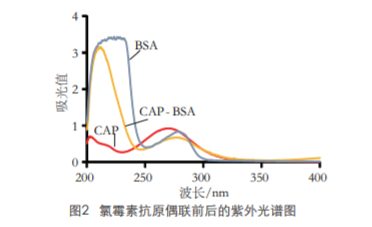 稱取10 mg氯霉素和丁 二酸酐溶于1 mL丙酮,振蕩反應(yīng)1.5 h。于40 ℃ 氮吹后,加入200 µL DMSO溶解殘留物,再分別 加入200 µL 5 mg/mL EDC和NHS溶液,振蕩反應(yīng) 2 h。再加入2 mL 5 mg/mL BSA溶液,振蕩反應(yīng)4 h,4 ℃下用1xPBS透析3 d,然后分裝,—20 ℃冷 凍保存?zhèn)溆谩?/span>