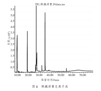 楓槭別名雞爪楓、槭樹,為槭樹科槭樹屬,主要 生長在美國和加拿大等美洲國家, 在中國長江流域 也有分布。 采用一定濃度的乙醇萃取楓槭樹皮等部 位,將溶劑去除獲得楓槭浸膏,楓槭浸膏為深褐色膏 體,具有強(qiáng)烈的焦糖香氣,可以用作食品添加劑以增 加烘烤、焦甜香。作為煙用香料,能夠提高煙香、矯正 卷煙吸味,增加卷煙自然清甜,改善卷煙余味,改善 干、澀、苦的口感 。 對(duì)楓槭浸膏揮發(fā)性成分有關(guān)報(bào) 道較少,蘇東贏將楓槭浸膏在不同溫度下進(jìn)行熱 裂解,因?yàn)樵诹呀膺^程中會(huì)發(fā)生熱解、加成等復(fù)雜的 化學(xué)反應(yīng),沒 有對(duì)楓槭浸 膏揮 發(fā) 性 成 分 進(jìn) 行 分析,不能表征楓槭浸膏的化學(xué)成分。通過對(duì)楓槭浸膏 揮發(fā)性成分進(jìn)行鑒定, 旨在明確楓槭浸膏揮發(fā)性成 分種類及含量, 以期為楓槭浸膏合理使用提供數(shù)據(jù)支撐。