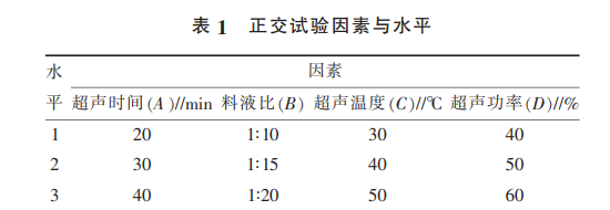 將樺褐孔菌粉末過篩, 準(zhǔn)確稱取 5 g 粉末溶于 30%的乙醇溶液中,分別改變提取條件為提取溫度、 提取時(shí)間、料液比以及超聲功率,用 80%的乙醇溶 液沉淀多糖后,4 000 r / min 離心 7 min 后取上清液, 減壓濃縮至浸膏后水浴至干,得粗制多糖,通過標(biāo)準(zhǔn) 曲線的方法測(cè)定含量。
