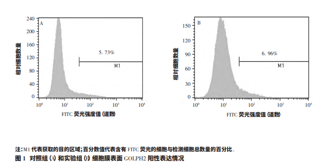 取對(duì)數(shù)生長(zhǎng)期的 SNU-423 細(xì)胞, 均勻接種于 6 孔板,待細(xì)胞長(zhǎng)至 80% ~ 90%時(shí),消化 收集細(xì)胞,移入 5 mL 的無(wú)菌離心管中,335 × g 離心 5 min;用 2 mL PBS 洗滌 2 次,調(diào)整離心管中細(xì)胞的 濃度為 1 × 106 個(gè) / mL。將細(xì)胞分為對(duì)照組及實(shí)驗(yàn) 組,對(duì)照組為 Goat Anti-Rabbit IgG HL 孵育過(guò)的細(xì) 胞;實(shí)驗(yàn)組為經(jīng) Anti-GOLPH2 抗體標(biāo)記 Goat AntiRabbit IgG HL 孵育過(guò)的細(xì)胞。