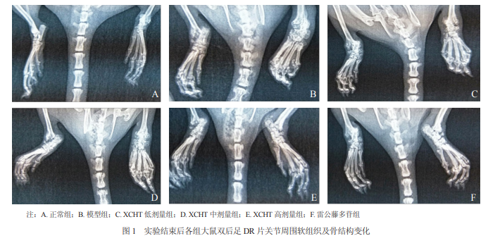 由圖 1 可見,正常組:大鼠雙踝關節(jié)周圍軟組織 無腫脹,無骨質(zhì)疏松、骨質(zhì)破壞。模型組:大鼠雙踝 關節(jié)周圍軟組織腫脹明顯,右踝較重,雙踝及跖趾關 節(jié)關節(jié)間隙不清,部分關節(jié)融合。XCHT 低劑量組: 大鼠雙踝關節(jié)周圍軟組織腫脹明顯,右踝較重,雙踝 及跖趾關節(jié)關節(jié)間隙不清,部分關節(jié)融合。XCHT 中劑量組:大鼠雙踝關節(jié)周圍軟組織腫脹明顯,右踝較 重,雙踝及跖趾關節(jié)關節(jié)間隙不清,部分關節(jié)融合。 XCHT 高劑量組:大鼠雙踝關節(jié)周圍軟組織腫脹明顯, 右踝較重;右踝及跖趾關節(jié)關節(jié)間隙不清,部分關節(jié) 融合,但較中劑量組及低劑量組程度輕;左踝及跖趾 關節(jié)關節(jié)間隙尚清,關節(jié)無融合。雷公藤多苷組:大鼠雙踝關節(jié)周圍軟組織腫脹明顯,右踝較重;右踝及 跖趾關節(jié)關節(jié)間隙不清,部分關節(jié)融合,但較中劑量 組及低劑量組程度輕,與高劑量組相似;左踝及跖趾 關節(jié)關節(jié)間隙尚清,關節(jié)無融合。