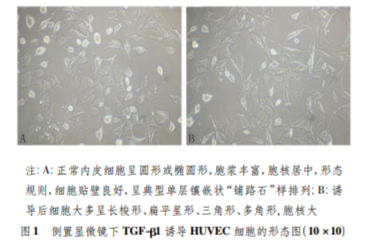 HUVEC 細胞內(nèi)皮間質(zhì)轉(zhuǎn)化過 程 10 μg·L - 1 TGF-β1 誘導 HUVEC 細胞 48 h 后, 顯微鏡下觀察細胞形態(tài)變化。