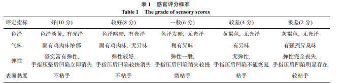 冷鮮雞的表觀狀態(tài)由 10 名專業(yè)人員評判, 評判標準 見表 1。從色澤、氣味、表面黏度和彈性 4 方面對冷鮮雞 進行評分, 然后將 4 項分值相加, 10 人評判平均值為最終 試驗結果, 最終得分 30 分以上表示一級新鮮, 20 分以上表 示二級新鮮, 8 分以下表示已經完全腐敗, 不宜食用。